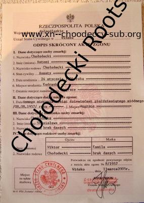 | Antoni Chołodecki | January 24, 1904 | 122 | Kudranka, gm. Ludwipol, pow. Kostopol, Wołyń, Poland (Ukraine) | 3 | August 8, 1957 | 68 | 53 | Wińsko, dolnośląskie, Poland | February 22, 2011 - 11:37:40 p.m. | M | YES | Y100 | ||||